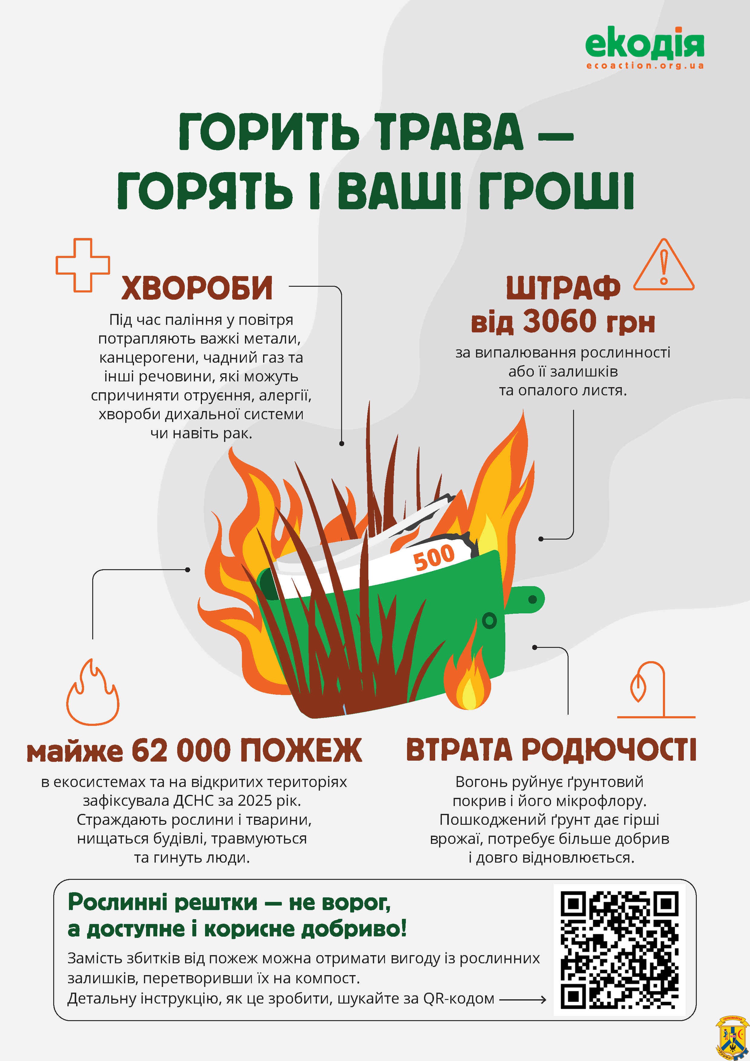 ⚠ Спалювання сухостою заборонене законом. За це передбачені штрафи: від 3 060 до 6 120 грн для громадян і від 15 300 до 21 420 грн для посадових осіб. За спалювання відходів (у тому числі листя) — від 340 до 1 360 грн. Якщо підпал стався на територіях природно-заповідного фонду або спричинив значні наслідки, відповідальність значно суворіша, аж до кримінальної.