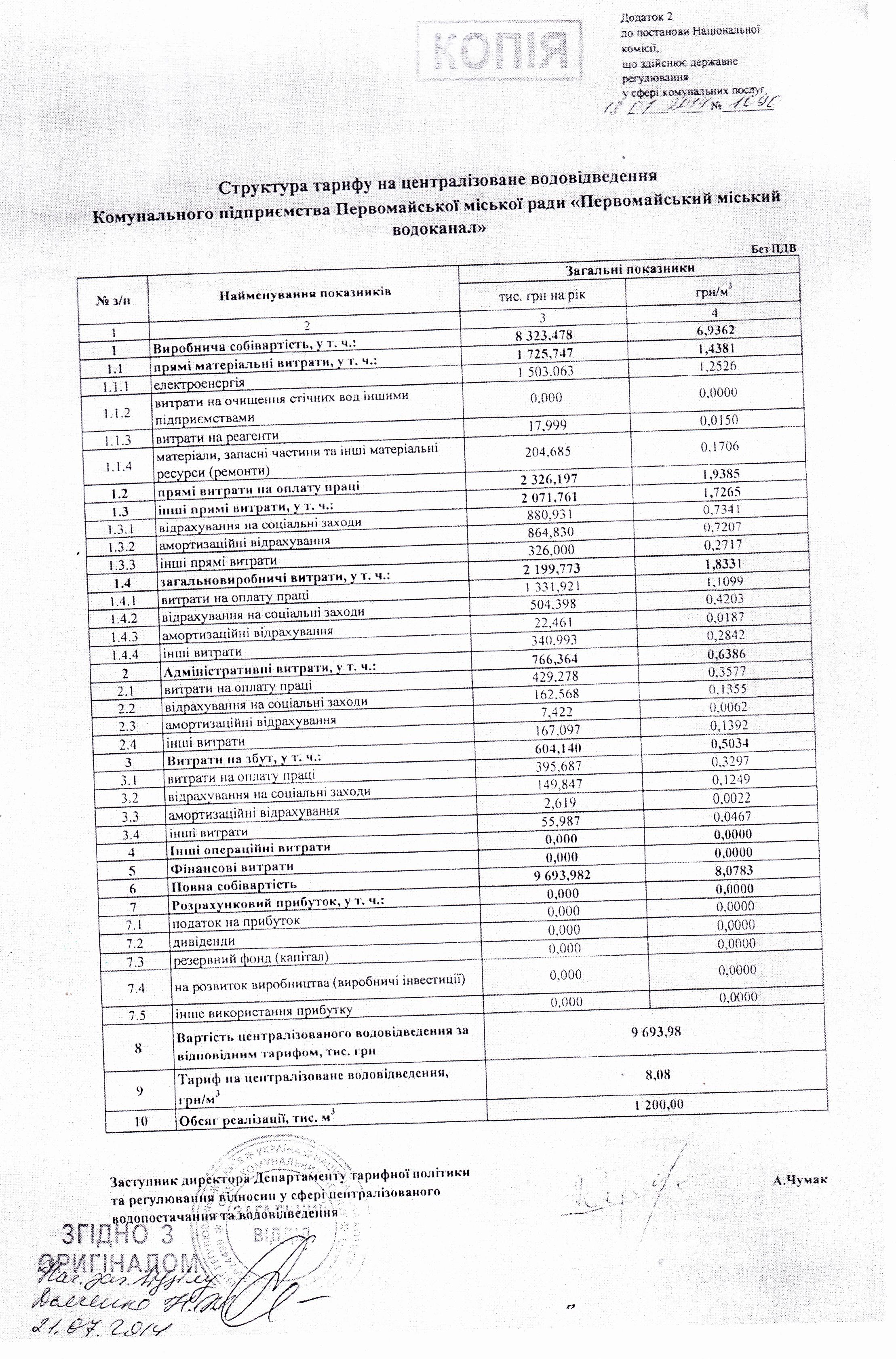 Комунальне підприємство Первомайської міської ради «Первомайський міський водоканал» повідомляє: відповідно до постанови Національної комісії, що здійснює державне регулювання у сфері комунальних послуг від 18.07.2014 р. №1090 «Про встановлення тарифів на централізоване водопостачання та водовідведення КП Первомайської міської ради «Первомайський міський водоканал» з 01 вересня 2014 року вводяться в дію наступні розміри тарифів для всіх груп споживачів: