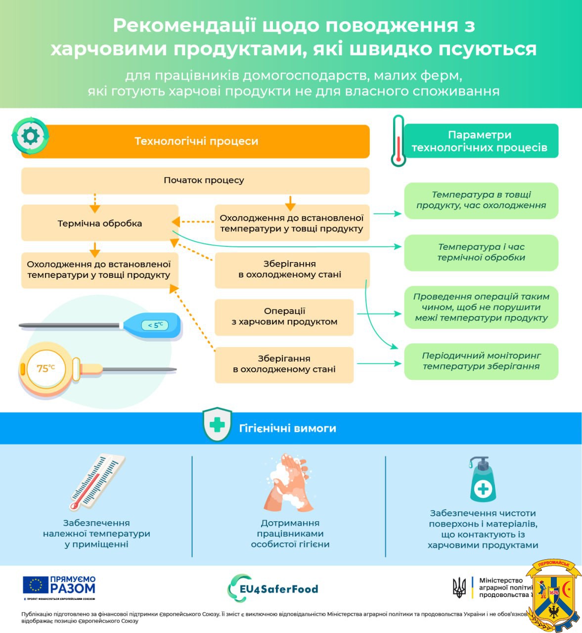 7) якщо харчові продукти мають зберігатися або пропонуватися до споживання при низьких температурах, вони повинні бути якнайшвидше охолоджені після стадії термічної обробки або останньої стадії виробництва до температури, яка не спричинить ризик здоров'ю споживачів;