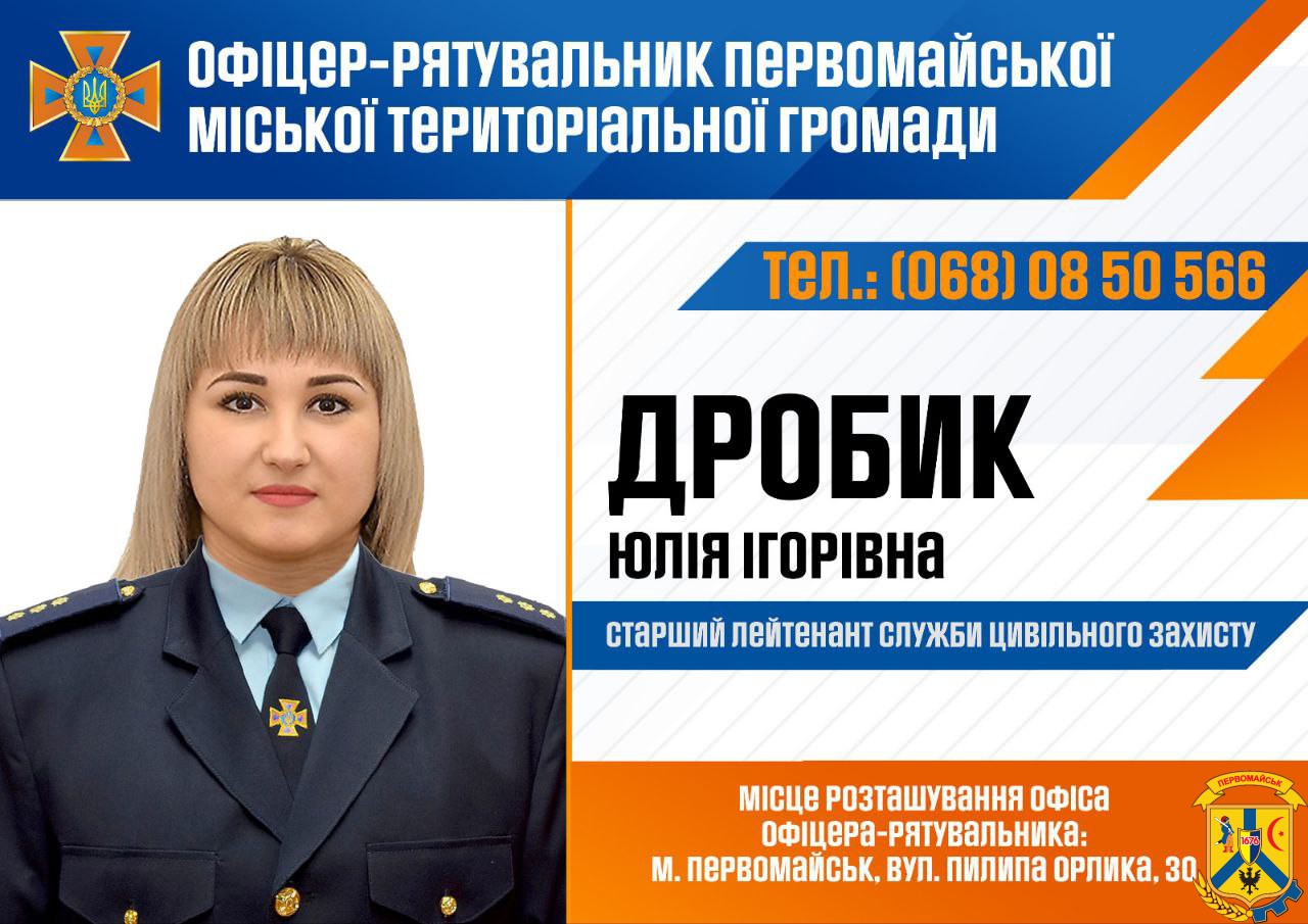 Старший лейтенант служби цивільного захисту ДРОБИК Юлія Ігорівна призначена офіцером-рятувальником Первомайської міської територіальної громади.