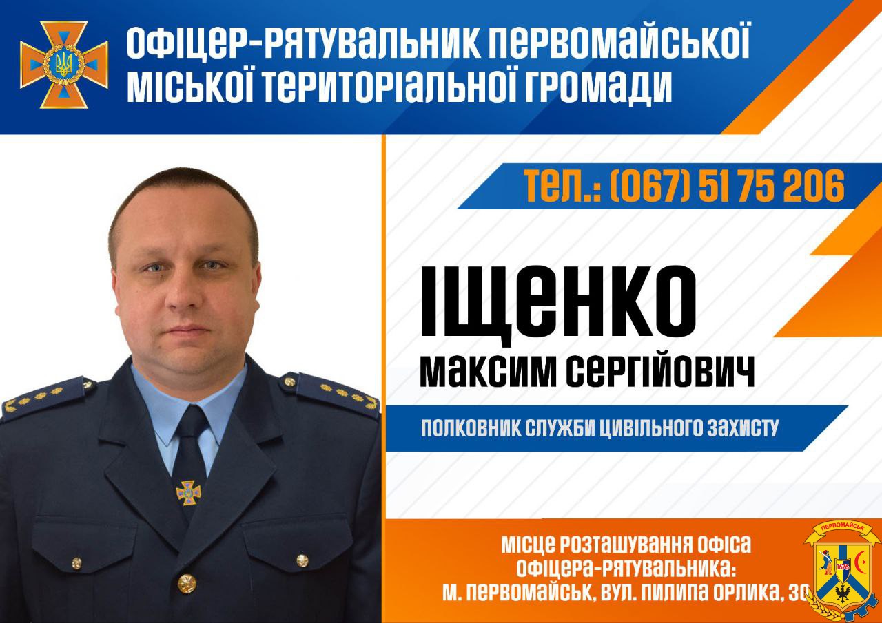 Полковник служби цивільного захисту ІЩЕНКО Максим Сергійович призначений офіцером-рятувальником Первомайської міської територіальної громади.