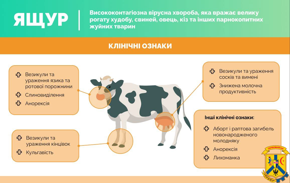 • пухирці та виразки в роті, на вимені чи ратицях;