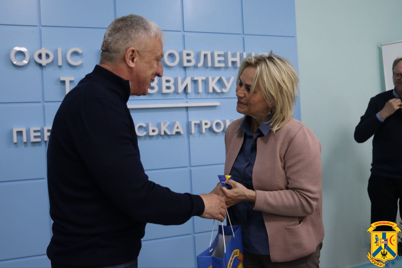 Наостанок учасники зустрічі мали змогу обмінятися контактами для подальшої комунікації та координації дій. Аби залишити приємну пам’ять про Первомайськ, очільник громади Олег Демченко вручив гостям символічні пам’ятні подарунки — як знак поваги, вдячності та надії на тривале партнерство.