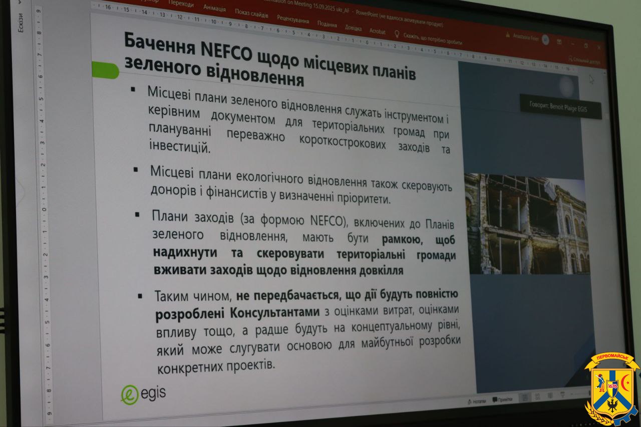 15 вересня 2025 року в офісі відновлення та розвитку Первомайської міської територіальної громади відбулася онлайн-зустріч у межах Програми «Зелене відновлення для України», що реалізується за підтримки Північної екологічної фінансової корпорації NEFCO.