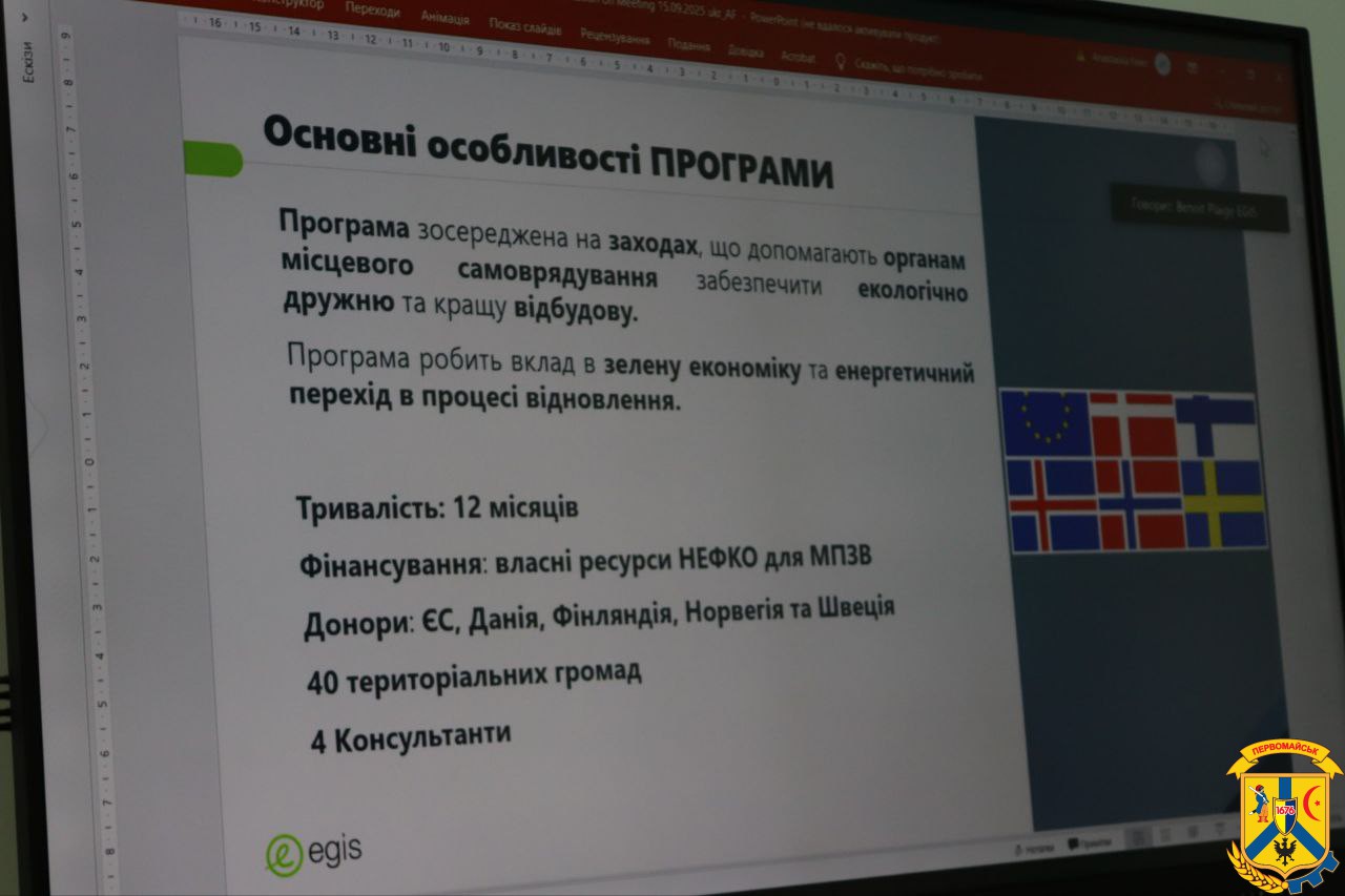 15 вересня 2025 року в офісі відновлення та розвитку Первомайської міської територіальної громади відбулася онлайн-зустріч у межах Програми «Зелене відновлення для України», що реалізується за підтримки Північної екологічної фінансової корпорації NEFCO