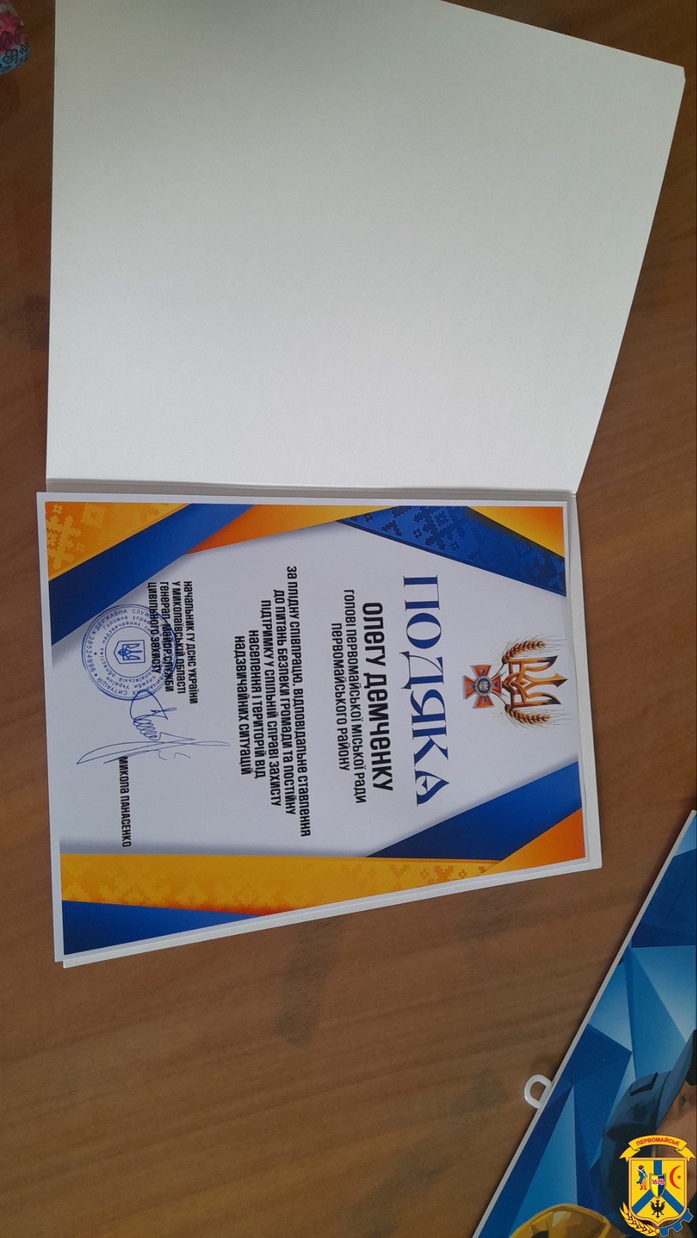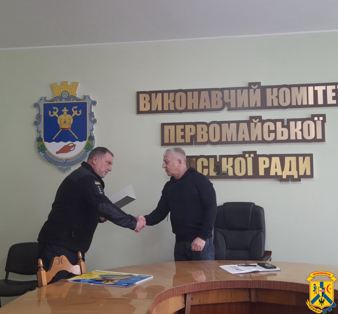 На початку наради до міської ради завітали начальник Первомайського районного управління цивільного захисту та превентивної діяльності, полковник служби цивільного захисту Сергій Ларіонов, спільно з офіцером-рятувальником громади Первомайської МТГ Юлією Дробик. Вони висловили слова щирої вдячності очільнику громади за плідну співпрацю, постійну підтримку та активне сприяння у питаннях безпеки, цивільного захисту населення й запобігання надзвичайним ситуаціям, а також вручили міському голові Подяку.